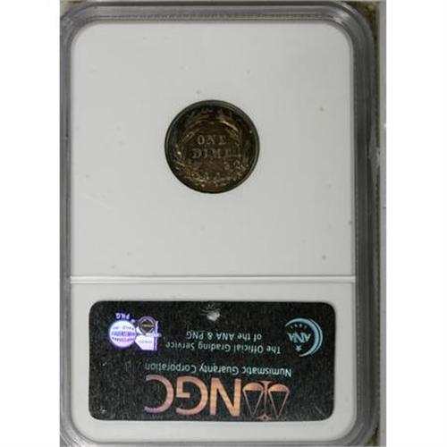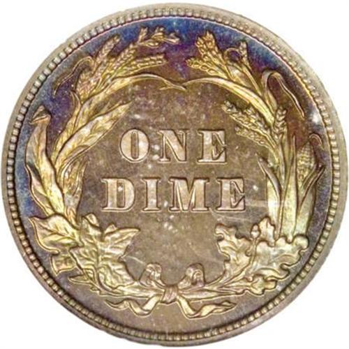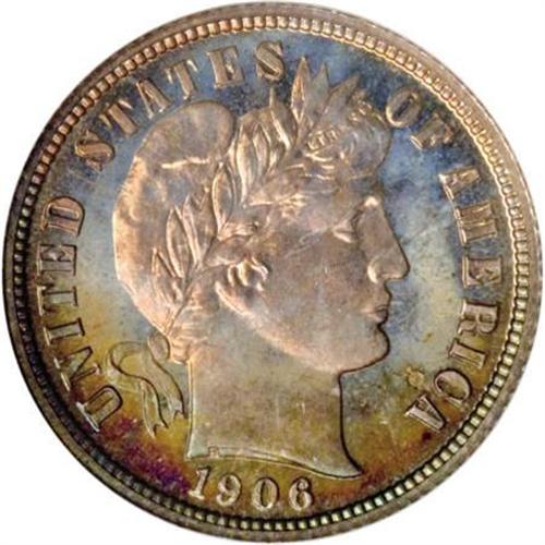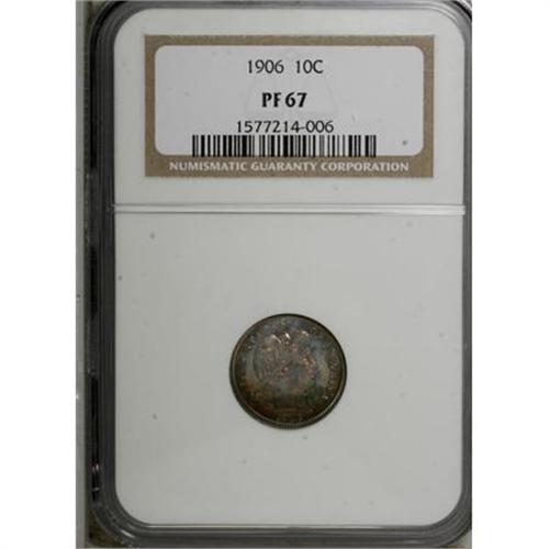 <B>1906 10C PR67 NGC.</B></I> Layers of lovely, original toning are intermingled over both sides of this marvelous Superb Gem proof. Electric-blue, salmon-red, apple-green and olive are just some of the colors on display. The design elements are fully struck, and bothersome hairlines or contact marks are absent. Census: 11 in 67, 3 finer (9/07). <BR><BR><B>Coin Engraver:</B> Charles E. Barber<BR><BR><b>Shipping:</b> Coins & Currency (<a target="_blank" href="http://www.heritageauctions.com/common/shipping.php">view shipping information</a>)