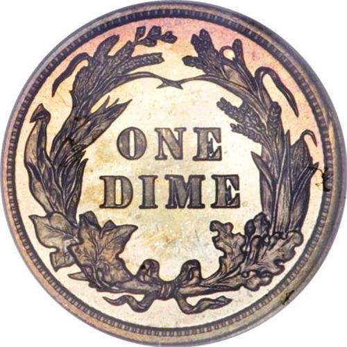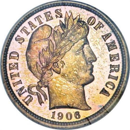 <B>1906 10C PR67 <img src="/images/star.gif" width="10" height="10" alt="" border="0"> NGC.</B></I> Splashes of olive-green, lavender, and violet are more vivid on the obverse of this lovely specimen. A well executed strike brings out virtually complete definition on the design features that stand out against the mirrored fields. There are no significant marks to report. Census: 1 in 67 <B><img src="/images/star.gif" width="10" height="10" alt="" border="0"></B></I>, 0 finer with Star (1/08).<BR><BR><B>Coin Engraver:</B> Charles E. Barber<BR><BR><b>Shipping:</b> Coins & Currency (<a target="_blank" href="http://www.heritageauctions.com/common/shipping.php">view shipping information</a>)