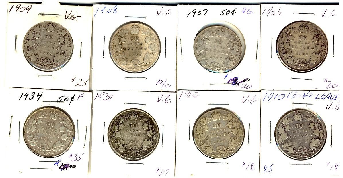 1906, 1907, 1908, 1909, 1910, 1931 & 1934 50¢. Lot of 7 coins Abt VG to VG10.