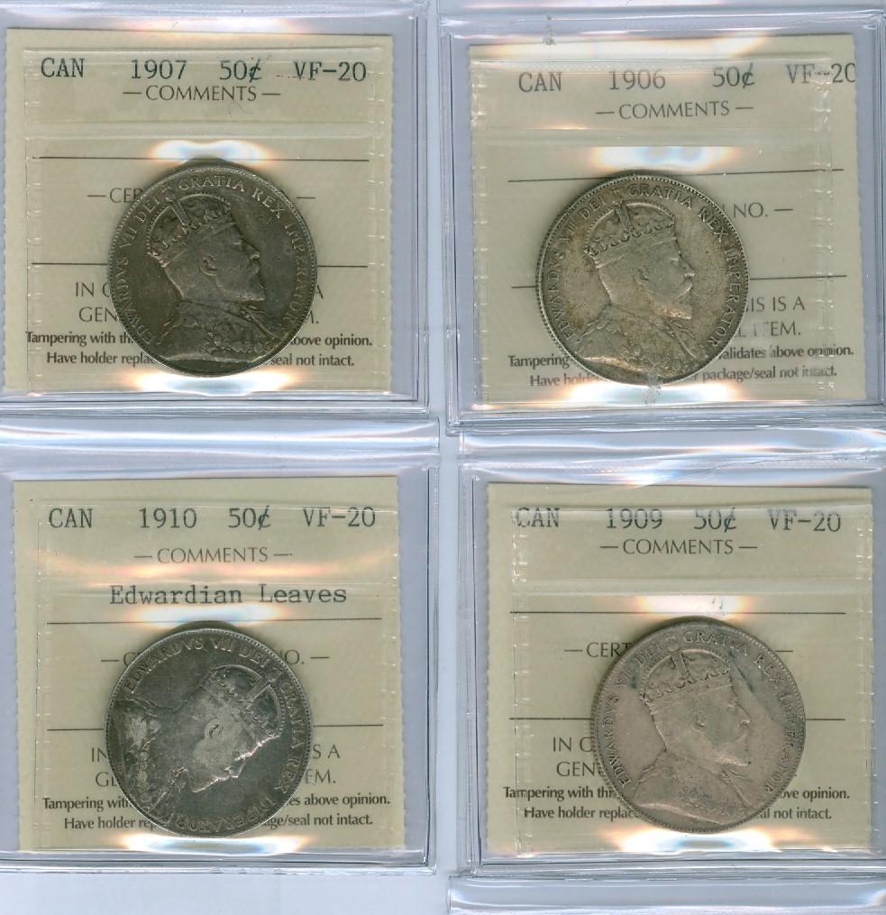 1906, 1907, 1909 & 1910 Edw Lvs 50¢. Lot of four coins all ICCS VF20.