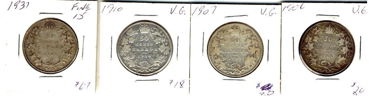 1906, 1907, 1910 Ed & 1931 50¢. Lot of 4 coins VG8.