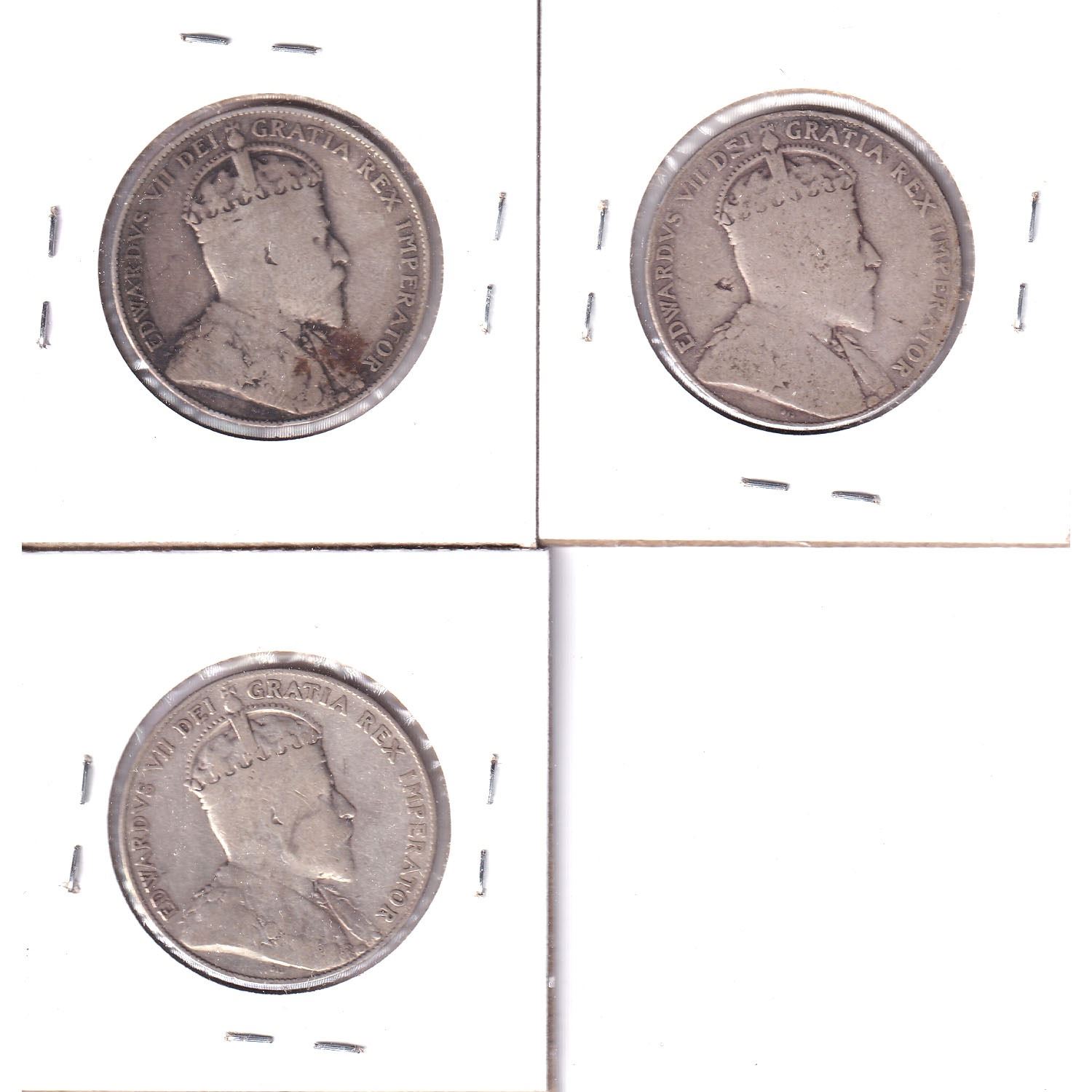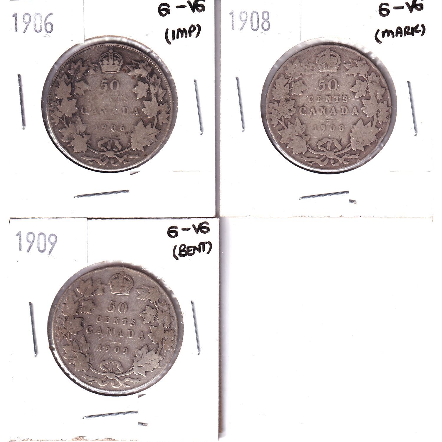 1906, 1908 & 1909 Canada 50-cent G-VG (coins contain various impairments). 3pcs