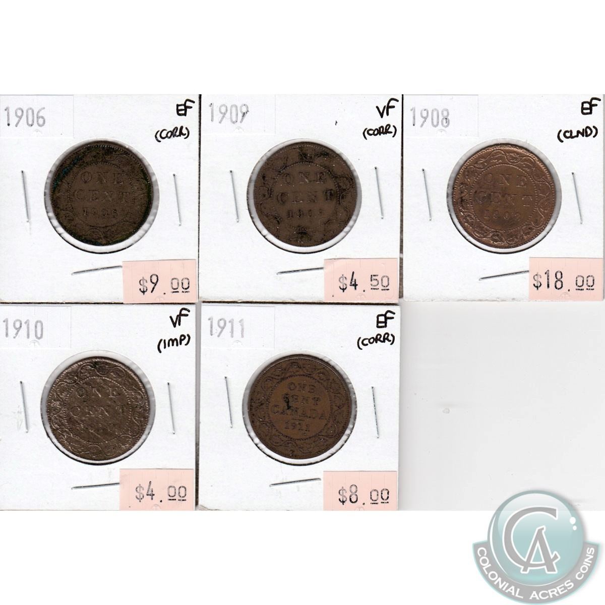 1906-1911 Canada 1-cents Very Fine to Extra Fine (impaired). 5pcs
