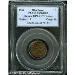 <B>1906 1C Indian Cent--Struck 10% Off Center--MS64 Red and Brown PCGS.</B></I> Struck slightly off center toward 2:30, all design elements are intact although a few letters in OF AMERICA and the right edge of the wreath are tight against the right border. This well struck mint error has rich orange color throughout the margins, while the fields and cheek are toned brown.<BR><I>From The Lonnie Gray Collection of Error Coins.</B></I> Lot:10834