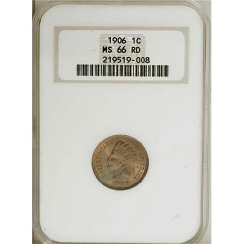 <B>1906 1C MS66 Red NGC.</B></I> A sharply struck salmon and peach survivor that shows whispers of plum in the fields. The strike is solid, and the surfaces offer fresh, vibrant luster with whispers of satin. Slight irregularity of the dentils has no impact on the coin's overall visual appeal. NGC has graded only one finer Red example (12/07).<BR><BR><B>Coin Engraver:</B> James B. Longacre<BR><BR><b>Shipping:</b> Coins & Currency (<a target="_blank" href="http://www.heritageauctions.com/common/shipping.php">view shipping information</a>)