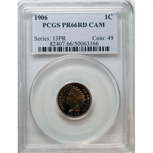 <B>1906 1C PR66 Red Cameo PCGS.</B></I> This lower-mintage proof (1,725 coins) is difficult to locate in full Red Gem Cameo, as can be seen from the population figures below. Deeply mirrored yellow-gold fields highlight the sharply struck copper-gold motifs. Both sides exhibit well preserved surfaces, but for complete accuracy we mention a light spot at the rim between the 1 and 9 of the date. Population: 2 in 66 Red Cameo, 1 finer (11/07).<BR><I>From The New York Eye Appeal Collection, Part Three.</B></I><BR><BR><b>Shipping:</b> Coins & Currency (<a target="_blank" href="http://www.heritageauctions.com/common/shipping.php">view shipping information</a>)