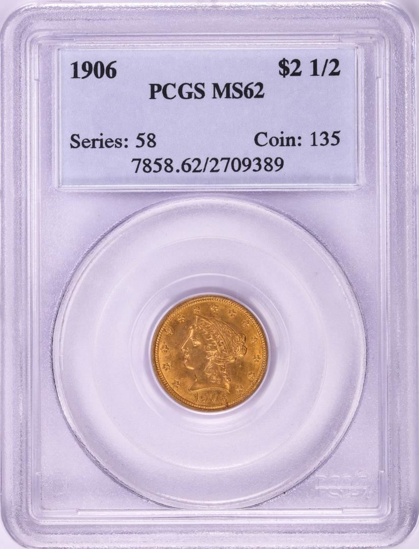 One 1906 $2 1/2 Liberty Head Quarter Eagle Gold Coin PCGS MS62. PCGS Graded.