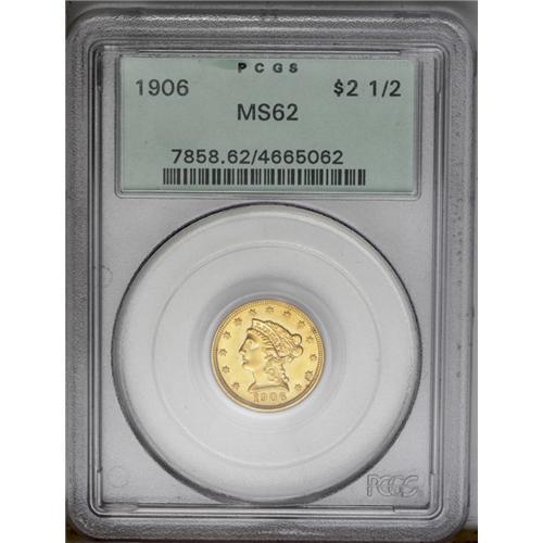 <B>1906<$2 1/2> MS62 PCGS.</B></I> The remarkably clean devices and the fields are wheat-colored with orange undertones. Most details are well struck up, though abrasions in the fields limit the grade.