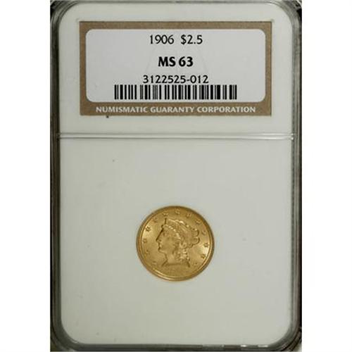 <B>1906 $2 1/2 MS63 NGC.</B></I> NGC Census: (825/1481). PCGS Population (1218/1603). Mintage: 176,300. Numismedia Wsl. Price for NGC/PCGS coin in MS63: $725. (#7858)<BR><BR><B>Coin Engraver:</B> Christian Gobrecht<BR><BR><b>Shipping:</b> Coins & Currency (<a target="_blank" href="http://www.heritageauctions.com/common/shipping.php">view shipping information</a>)