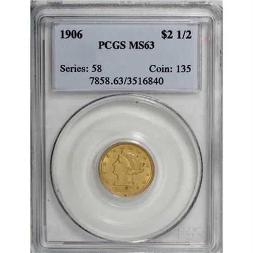 <B>1906 $2 1/2 MS63 PCGS.</B></I> PCGS Population (1198/1538). NGC Census: (814/1424). Mintage: 176,300. Numismedia Wsl. Price for NGC/PCGS coin in MS63: $730. (#7858)<BR><BR><B>Coin Engraver:</B> Christian Gobrecht<BR><BR><b>Shipping:</b> Coins & Currency (<a target="_blank" href="http://www.heritageauctions.com/common/shipping.php">view shipping information</a>)