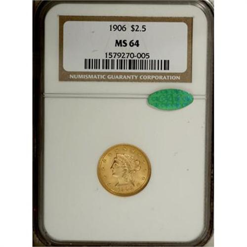 <B>1906 $2 1/2 MS64 NGC. CAC.</B></I> A crisply struck and shining near-Gem example from this late-date quarter eagle issue, predominantly yellow-gold with slivers of paler straw in the reverse fields. Highly appealing for the grade.<BR><BR><B>Coin Engraver:</B> Christian Gobrecht<BR><BR><b>Shipping:</b> Coins & Currency (<a target="_blank" href="http://www.heritageauctions.com/common/shipping.php">view shipping information</a>)