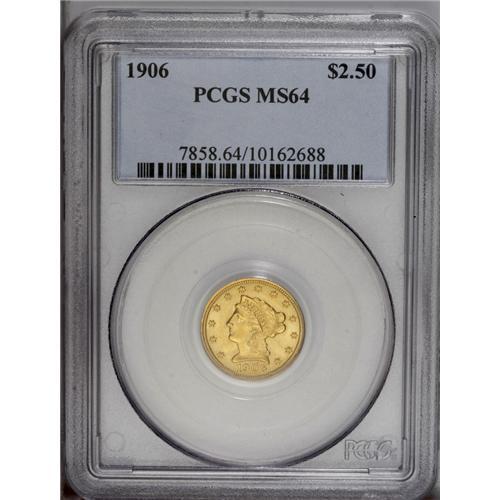 <B>1906<$2 1/2> MS64 PCGS.</B></I> Choice and boldly struck. The peach-gold surfaces have few marks for the grade, but this coin's subdued luster keeps it from Gem status.