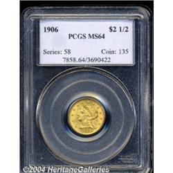 <B>1906<$2 1/2> MS64 PCGS.</B></I> Copper-gold toning with light green undertones overlies lustrous surfaces. A touch of softness is seen in Liberty's hair, the remaining design features being sharply struck. A few small marks are apparent on Liberty's face and neck. <BR><BR><B>Important notice:</B> Heritage usually auctions material at the rate of 200-250 lots per hour. On some occasions eBay Live bid software or the Internet may not be able to keep up with the pace of the auction. We recommend placing a realistic absentee bid now as insurance to avoid disappointment. Occasionally the auctioneer may eliminate or reject an eBay Live bid, and the auctioneer may also reopen a lot after the close of the eBay live bidding (usually because we missed an audience bid), and may reject your bid even if it shows you as the winning bidder. By bidding via eBay Live, you agree that Heritage may award the lot to another bidder at its sole discretion under the circumstances described above or any other reasonable circumstances. Since eBay bids are not shown to us until we open the lot on the floor, we treat those bids just like floor bids. In most cases the floor responds before the eBay bid is presented to us, due to Internet lag time, so for consistency we have made it a policy that floor bids are always considered first over tie eBay live bids. Also please note that all Heritage lots purchased through eBay Live carry a 20% Buyer's Premium. Please make sure you read the Terms and Conditions before you bid. </span></font></tr></table></td></tr></table>