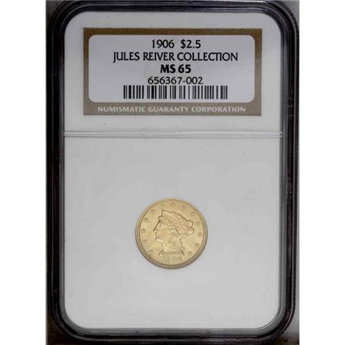 <B>1906<$2 1/2> MS65 NGC.</B></I> An inordinately preserved honey-gold Gem, fully lustrous and exceptionally attractive from a technical perspective. Not fully struck on LIBERTY or the top of the curl beneath the ear, and a small wine-colored spot is noted beneath the D in the denomination. Envelope Included.