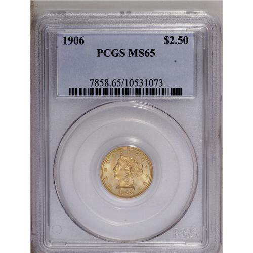 <B>1906<$2 1/2> MS65 PCGS.</B></I> This exactingly struck Gem has bright orange-gold centers and pale green-gold margins. Potent luster illuminates the beautifully smooth fields. The eagle is also void of marks, and Liberty has only inconsequential contact. A good candidate for a high quality 20th century gold type set.