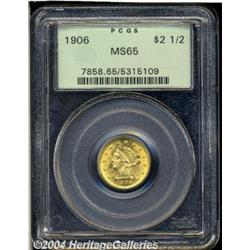 <B>1906<$2 1/2> MS65 PCGS.</B></I> Fully struck with sparkling luster, beautiful bright yellow and green-gold colors, and no visual distractions on either side of this bewitching Gem.<BR><I>From The Greenwich Collection, Part One.</B></I> <BR><BR><B>Important notice:</B> Heritage usually auctions material at the rate of 200-250 lots per hour. On some occasions eBay Live bid software or the Internet may not be able to keep up with the pace of the auction. We recommend placing a realistic absentee bid now as insurance to avoid disappointment. Occasionally the auctioneer may eliminate or reject an eBay Live bid, and the auctioneer may also reopen a lot after the close of the eBay live bidding (usually because we missed an audience bid), and may reject your bid even if it shows you as the winning bidder. By bidding via eBay Live, you agree that Heritage may award the lot to another bidder at its sole discretion under the circumstances described above or any other reasonable circumstances. Since eBay bids are not shown to us until we open the lot on the floor, we treat those bids just like floor bids. In most cases the floor responds before the eBay bid is presented to us, due to Internet lag time, so for consistency we have made it a policy that floor bids are always considered first over tie eBay live bids. Also please note that all Heritage lots purchased through eBay Live carry a 20% Buyer's Premium. Please make sure you read the Terms and Conditions before you bid.