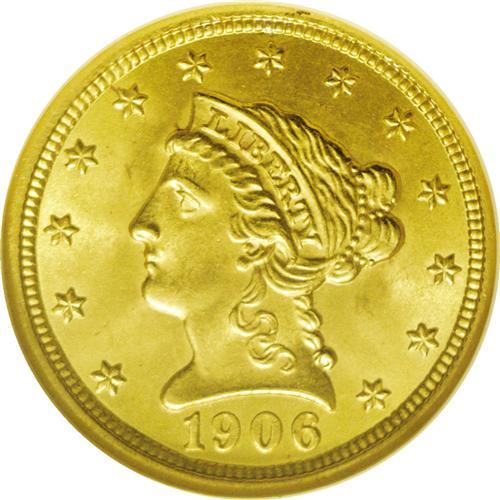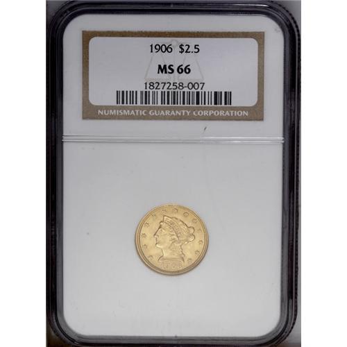 <B>1906 $2 1/2 MS66 NGC.</B></I> A sharply struck coin that offers abundant luster and clean surfaces. Identifiable by a minute disturbance in the field below Liberty's hairbun. Production numbers increased as this long running style finally came to its inevitable end in 1907, and type collectors eagerly snap these Premium Gems up.