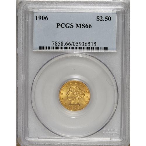 <B>1906 $2 1/2 MS66 PCGS.</B></I> Scrumptious luster dazzles peach-gold surfaces on this Premium Gem. An excellent strike brings out all of the design features, and both sides are impeccably preserved. The 1906 is common in all grades.<BR><BR><b>Shipping:</b> Coins & Currency (<a target="_blank" href="http://www.heritageauctions.com/common/shipping.php">view shipping information</a>)