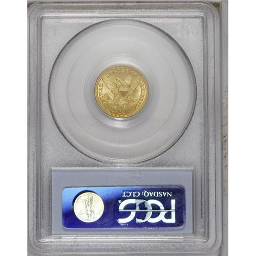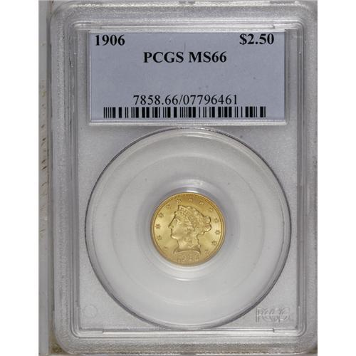 <B>1906<$2 1/2> MS66 PCGS.</B></I> This piece would make an excellent plate coin for a reference work on Liberty quarter eagles. The striking details are all crisply articulated and there are no pesky die clash marks or planchet flaws. Mustard-gold toning with faint greenish undertones is evenly distributed across both sides. The satiny luster is pleasing if not spectacular, and a faint nick located between Liberty's ear and cheekbone is the only potential pedigree marker. A lovely and technically unimpeachable Premium Gem.