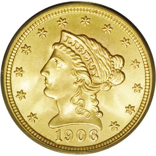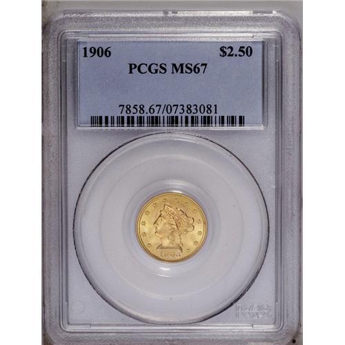 <B>1906<$2 1/2> MS67 PCGS.</B></I> Fully struck and virtually pristine, this radiantly lustrous yellow-gold Superb Gem is a visual delight. Very few exist at such a lofty level of preservation, and just one piece has been graded finer, by PCGS (2/06).