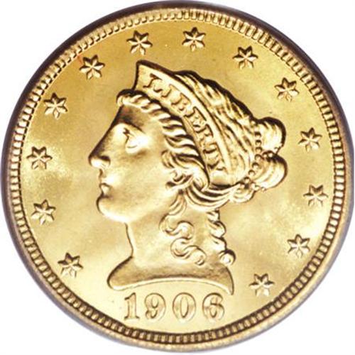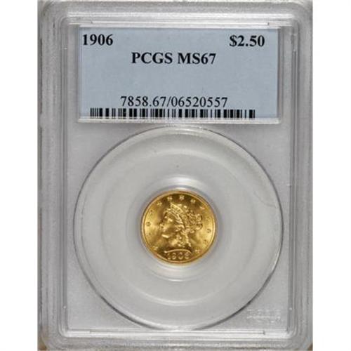 <B>1906 $2 1/2 MS67 PCGS.</B></I> The vibrant honey-gold and lemon-gold surfaces retain the same flashy, powerful luster that they had a century ago, and the decisively struck devices remain just as sharp. Carefully preserved and practically flawless to the unaided eye, this coin would make an excellent addition to a top-notch type set. NGC has graded just two coins finer, while PCGS notes just one (5/07).<BR><BR><b>Shipping:</b> Coins & Currency (<a target="_blank" href="http://www.heritageauctions.com/common/shipping.php">view shipping information</a>)