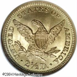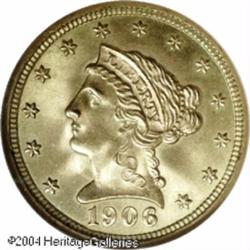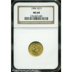 1906 $2 1/2 MS68 NGC. After striking, most all Qua <B>1906 $2 1/2 MS68 NGC.</B></I> After striking, most all Quarter Eagles were bagged for dispersal to banks that specifically requested coinage. During the production and shipping process, most all gold coins accumulated at least a few abrasions from coin-to-coin contact within the bags. Amazingly, this piece was spared this almost inevitable fate, and managed to survive with essentially abrasion-free surfaces. The frosty, green-gold fields evidence razor sharp definition that draws forth every last design feature. With uncommonly smooth features and exceptional eye appeal, this coin would grace any high quality type set with its presence. Currently, (11/04) it is tied with just one other MS68 at NGC as the finest known 1906 Quarter Eagle. <BR><BR><B>Important notice:</B> Heritage usually auctions material at the rate of 200-250 lots per hour. On some occasions eBay Live bid software or the Internet may not be able to keep up with the pace of the auction. We recommend placing a realistic absentee bid now as insurance to avoid disappointment. Occasionally the auctioneer may eliminate or reject an eBay Live bid, and the auctioneer may also reopen a lot after the close of the eBay live bidding (usually because we missed an audience bid), and may reject your bid even if it shows you as the winning bidder. By bidding via eBay Live, you agree that Heritage may award the lot to another bidder at its sole discretion under the circumstances described above or any other reasonable circumstances. Since eBay bids are not shown to us until we open the lot on the floor, we treat those bids just like floor bids. In most cases the floor responds before the eBay bid is presented to us, due to Internet lag time, so for consistency we have made it a policy that floor bids are always considered first over tie eBay live bids. Also please note that all Heritage lots purchased through eBay Live carry a 20% Buyer's Premium. Please make sure you read the Terms and Conditions before you bid. This lot is being auctioned in conjunction with a live floor auction by Heritage Galleries & Auctioneers. All final auction and invoice information will be supplied by Heritage Galleries & Auctioneers, and all other information should be considered preliminary. Lot:6531