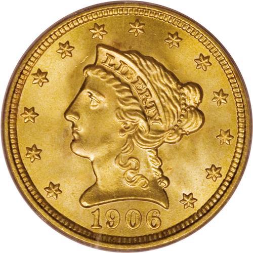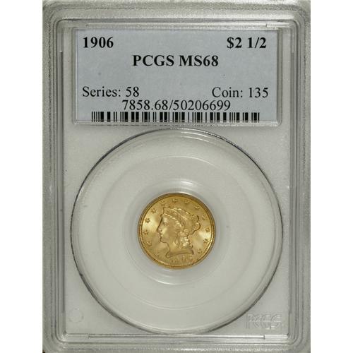 <B>1906 $2 1/2 MS68 PCGS.</B></I> Just eight Liberty quarter eagles have been certified as MS68 (see our commentary above for the 1904), and two of them are offered in the present sale. Not only are these exceptional coins ideal for advanced and high quality date sets of the series, but they are also important pieces for type collectors who are seeking the best possible coins. This specimen is sharply detailed and has gorgeous orange-gold mint frost. The surfaces are pristine and virtually perfect with only a single tiny orange toning spot above Liberty's hair. Population: 1 in 68, 0 finer (3/07).<BR><BR><b>Shipping:</b> Coins & Currency (<a target="_blank" href="http://www.heritageauctions.com/common/shipping.php">view shipping information</a>)