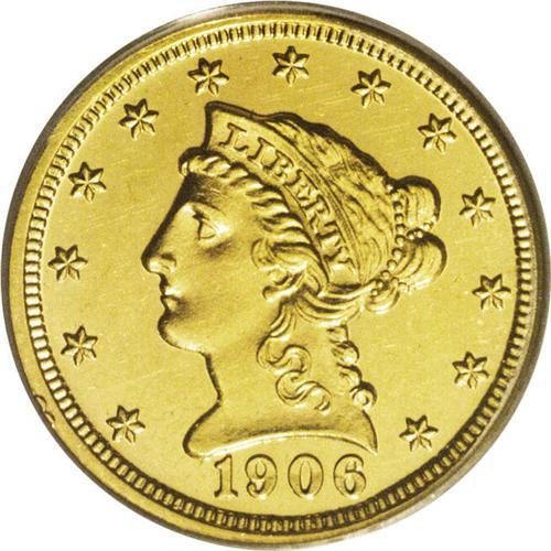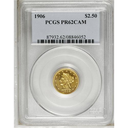 <B>1906<$2 1/2> PR62 Cameo PCGS.</B></I> This pleasing example of the <I>creme de la creme</B></I> of U.S. numismatics should prove just right for some fortunate bidder. Without a loupe the surfaces appear pristine, but with magnification light hairlines appear that preclude a higher grade. The eye appeal remains high, however. Population: 4 in 62 Cameo, 21 finer (8/06).