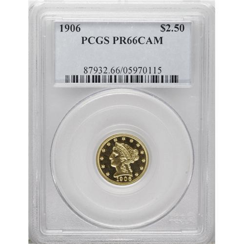 <B>1906 $2 1/2 PR66 Cameo PCGS.</B></I> PCGS and NGC have certified about 280 examples of the 1906 proof quarter eagle, this despite the fact that 160 proof coins were produced! This obviously includes many resubmissions. While the date is common for the type in proof, examples such as the outstanding PR66 Cameo in the current lot are not seen that frequently. When viewed from directly overhead, this coin yields a gold-on-black appearance. A powerful strike befitting a proof manifests itself in crisp definition on all of the design elements, and peach-gold surfaces are immaculately preserved. Population: 10 in 66 Cameo, 2 finer (1/07).<BR><BR><b>Shipping:</b> Coins & Currency (<a target="_blank" href="http://www.heritageauctions.com/common/shipping.php">view shipping information</a>)