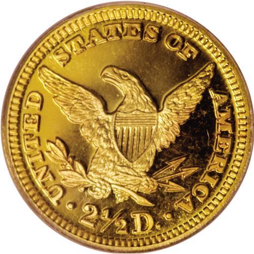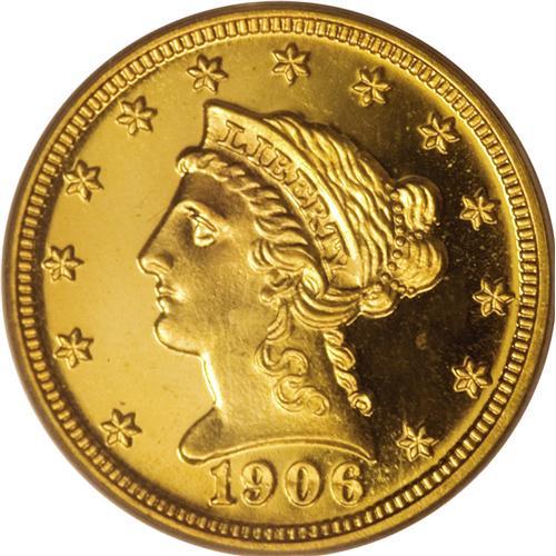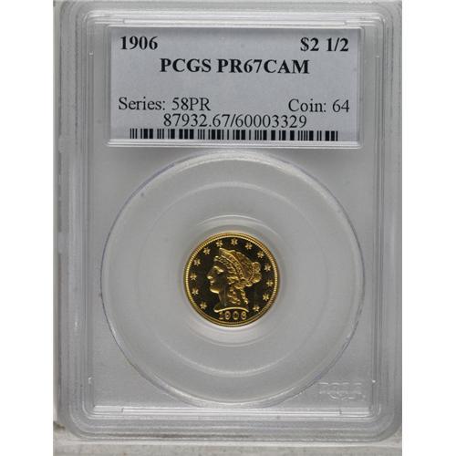 <B>1906 $2 1/2 PR67 Cameo PCGS.</B></I> Among the finer surviving examples from a mintage of just 160 coins, this piece has remarkable orange-gold color on both sides, with sharply defined devices. The surfaces are fully brilliant with deeply mirrored fields and the devices exhibit just enough mint frost to receive the Cameo designation. Authors Jeff Garrett and Ron Guth consider this to be an excellent choice for type collectors: "An example can be found with a few months' effort and a little cash. Proof gold coinage can be an incredible bargain at today's prices. Coins of the proof format are all rare and represent the finest of the coining process."<BR><BR><b>Shipping:</b> Coins & Currency (<a target="_blank" href="http://www.heritageauctions.com/common/shipping.php">view shipping information</a>)