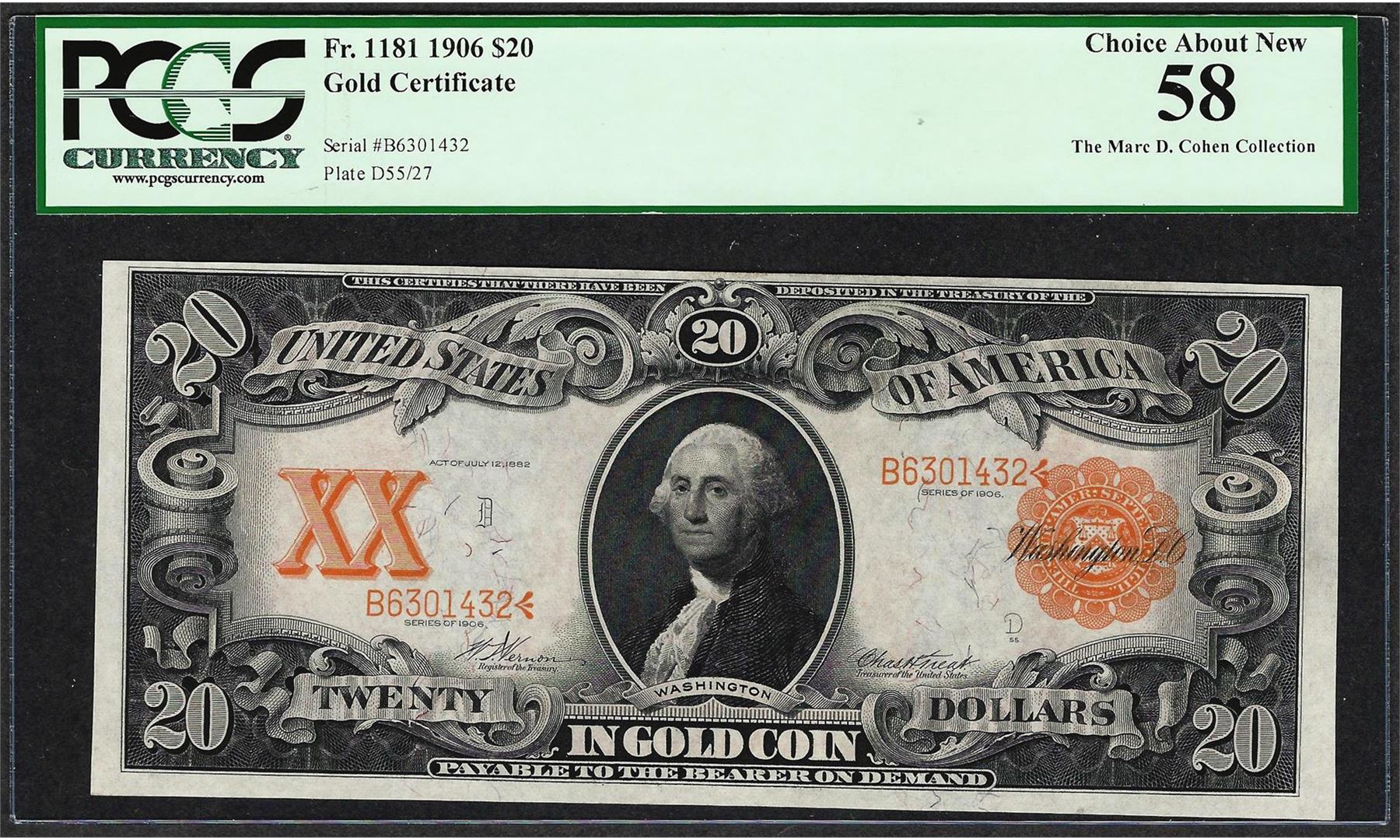 One 1906 $20 Gold Certificate Note Fr.1181 PCGS Choice About New 58. PCGS Graded.