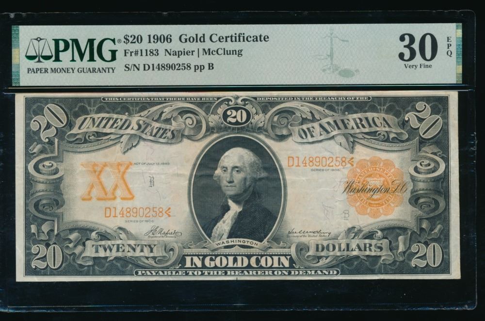 One 1906 $20 Gold Certificate PMG 30EPQ.