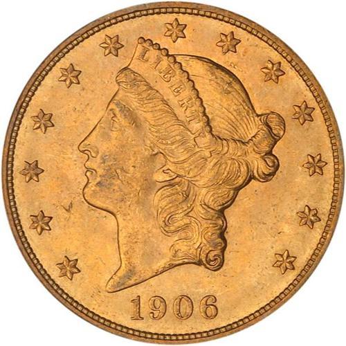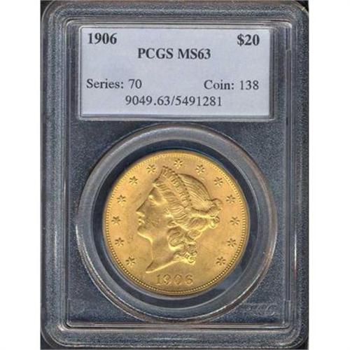 <b>1906 $20 Liberty. PCGS graded MS63.</b> A few bagmarks on the cheek barely impact the original frosty luster. This warmly colored example displays beams of golden metallic detail in virtually all areas. There are some who consider the 1906 to be the rival of the 1905 in rarity, but we see a few more choice specimens like this offered of the 1906. Mintage: 69,690 pieces according to the Red Book, or 69,596 according to recently published Bowers guide to double eagles (not that the difference matters) <b>(PCGS # 9049)</b> <i>