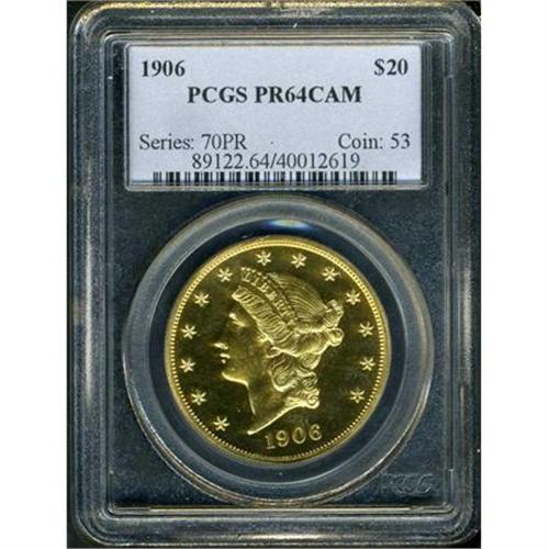 <b>1906 $20 Liberty. PCGS graded PF64 CAM.</b> Pop: 1/1. A unforgettable piece with sleek yellow-gold surfaces and nicely mirrored fields. A moderate amount of hazy patina overlays each side lending a fully original appearance. The strike is typically strong, although we note that the hair behind Liberty's ear and the central reverse devices are marginally incomplete. No obvious distractions to prevent this example from attaining possibly an even finer grade designation. With low productions that rarely exceeded 100 pieces, proof Type 3 Liberty Double Eagles are of the maximum rarity and desirability. The impaired state of many survivors, tied to the meager mintage of its corresponding business strike, only enhances the attraction of this splendid coin. From an original mintage of only 94, one of the few full "cameo" Proofs available to collectors (This 1906, due to extensive polishing of the die during preparation, has the bridge of Liberty's nose broken at the eye, a common occurrence seen on numerous gold Proofs, not only the double eagles.).