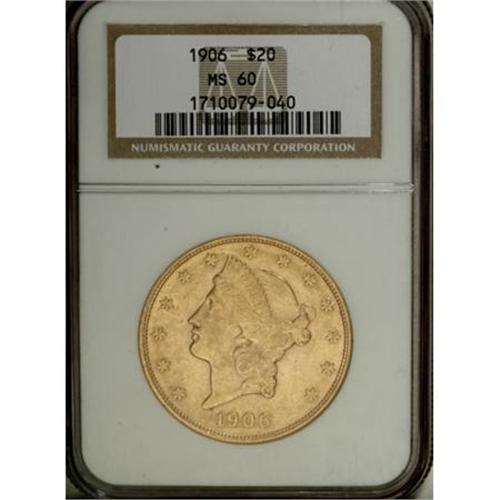 <B>1906 $20 MS60 NGC.</B></I> Solidly struck with elements of green-gold that add interest to the significantly abraded yellow-gold surfaces. An unworn survivor from this lower-mintage Philadelphia issue, which has a total business strike production of just 69,596 pieces.<BR><I>From The York/Hallenbeck #2 Current Finest PCGS Registry Set of Liberty Double Eagles.</B></I><BR><BR><B>Coin Engraver:</B> James B. Longacre<BR><BR><b>Shipping:</b> Coins & Currency (<a target="_blank" href="http://www.heritageauctions.com/common/shipping.php">view shipping information</a>)