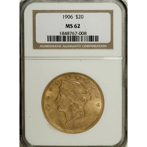 1906 $20 MS62 NGC. Of the 69,596 pieces coined, only a