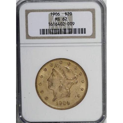 <B>1906 $20 MS62 NGC.</B></I> A better date twenty with a mintage of a mere 69,596 pieces. This lustrous sun-gold representative is surprisingly unabraded for the grade, with the exception of a brief curved obverse mark at 5 o'clock.<BR><BR><b>Shipping:</b> Coins & Currency (<a target="_blank" href="http://www.heritageauctions.com/common/shipping.php">view shipping information</a>)