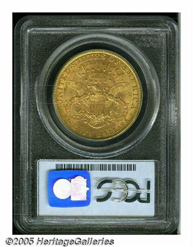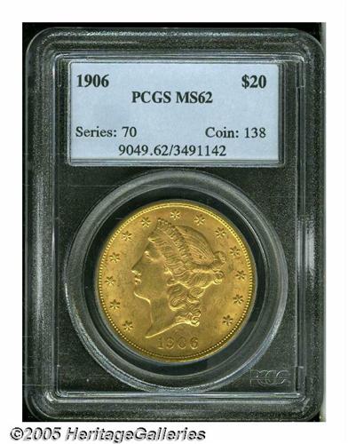<B>1906<$20> MS62 PCGS.</B></I> Frosty light yellow luster with accents of pink on both sides. Excellent quality for the grade. This is a popular issue from a low mintage of just 69,500 coins.