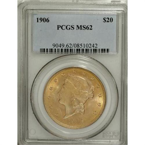 <B>1906 $20 MS62 PCGS.</B></I> Hints of turquoise add variety to the otherwise consistently orange-gold surfaces. Strongly lustrous with pleasing detail for this late-date Philadelphia issue.<BR><BR><B>Coin Engraver:</B> James B. Longacre<BR><BR><b>Shipping:</b> Coins & Currency (<a target="_blank" href="http://www.heritageauctions.com/common/shipping.php">view shipping information</a>)