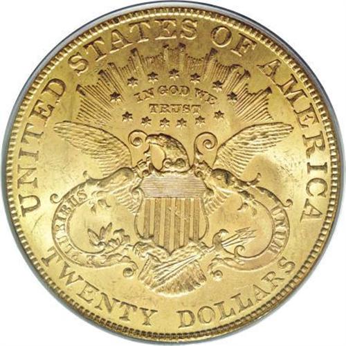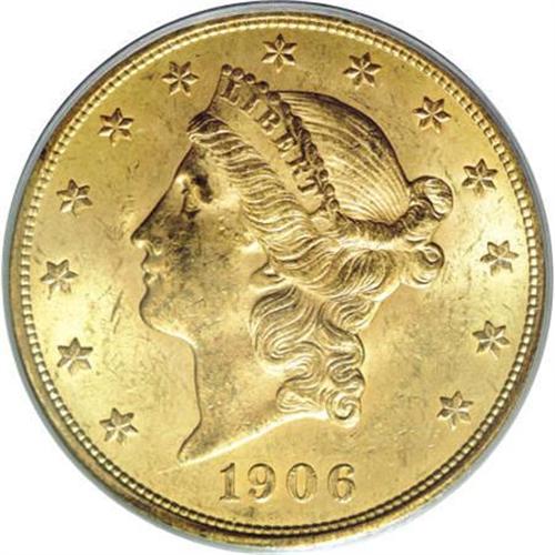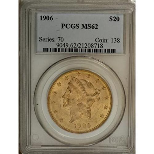 <B>1906 $20 MS62 PCGS.</B></I> Yellow-gold surfaces display a slight greenish cast, and possess sharply struck design elements; Liberty's hair and the eagle's plumage are especially sharp. Soft luster exudes from both sides, each of which has a scattering of minute contact marks. The 1906 is a somewhat scarce issue.<BR><BR><B>Coin Engraver:</B> James B. Longacre<BR><BR><b>Shipping:</b> Coins & Currency (<a target="_blank" href="http://www.heritageauctions.com/common/shipping.php">view shipping information</a>)