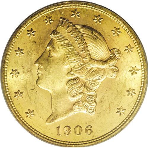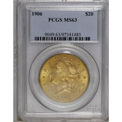 1906 $20 MS63 PCGS. Generally well struck, if slightly
