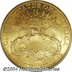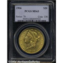 <B>1906<$20> MS63 PCGS.</B></I> One of a mere 69,690 pieces produced, this satiny example displays remarkably few abrasions for the Select level. The golden-rose surfaces are indicative of originality and the eye appeal would do justice to an even higher grade. <BR><BR><B>Important notice:</B> Heritage usually auctions material at the rate of 200-250 lots per hour. On some occasions eBay Live bid software or the Internet may not be able to keep up with the pace of the auction. We recommend placing a realistic absentee bid now as insurance to avoid disappointment. Occasionally the auctioneer may eliminate or reject an eBay Live bid, and the auctioneer may also reopen a lot after the close of the eBay live bidding (usually because we missed an audience bid), and may reject your bid even if it shows you as the winning bidder. By bidding via eBay Live, you agree that Heritage may award the lot to another bidder at its sole discretion under the circumstances described above or any other reasonable circumstances. Since eBay bids are not shown to us until we open the lot on the floor, we treat those bids just like floor bids. In most cases the floor responds before the eBay bid is presented to us, due to Internet lag time, so for consistency we have made it a policy that floor bids are always considered first over tie eBay live bids. Also please note that all Heritage lots purchased through eBay Live carry a 20% Buyer's Premium. Please make sure you read the Terms and Conditions before you bid. </span></font></tr></table></td></tr></table>