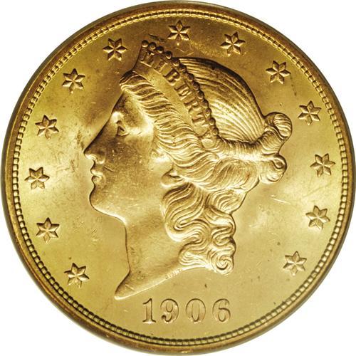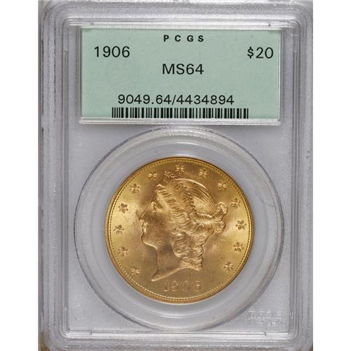<B>1906 $20 MS64 PCGS.</B></I> The 1906 twenty dollar gold piece is clearly an undervalued coin. Despite a relatively small mintage of 69,596 coins, circulated examples of the 1906 double eagle are often valued on par with other dates within the series that were issued by the millions. The value discrepancy changes quickly above the MS63 level as few examples exist, and most of those that are available have only come into the marketplace with the past few decades, thanks to the repatriation of some European holdings. PCGS has graded 19 coins in MS64, with only seven finer, including a lone MS66 example (4/07). The NGC <I>Census Report</B></I> records even lower results. To further exemplify the true rarity of the 1906 double eagle in near-Gem or better condition, consider that the finest example in any PCGS <I>Set Registry,</B></I> including the top five of the <I>All-Time Finest, </B></I> is an MS64. That particular coin is the Harry W. Bass, Jr. coin. Even the Smithsonian collection lacks an example of this date. As more collectors compete to build high grade sets, the value of the 1906 twenties will surely increase dramatically, as the demand for this date will far outweigh the supply. Certified in a green-label holder.<BR><BR><b>Shipping:</b> Coins & Currency (<a target="_blank" href="http://www.heritageauctions.com/common/shipping.php">view shipping information</a>)