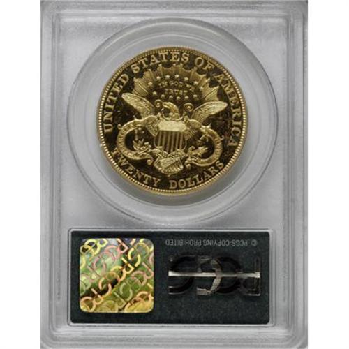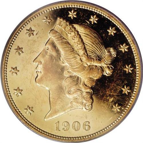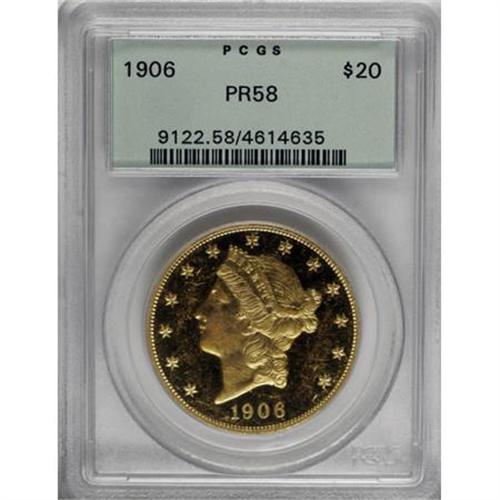<B>1906 $20 PR58 PCGS.</B></I> Wispy field marks confirm brief non-numismatic handling, but the honey-gold fields retain nearly all of their initial mirrored flash. A low mintage date, with only 94 proofs struck in addition to just 69,596 business strikes. Housed in a green label holder. Population: 2 in 58, 33 finer (8/07).<BR><BR><B>Coin Engraver:</B> James B. Longacre<BR><BR><b>Shipping:</b> Coins & Currency (<a target="_blank" href="http://www.heritageauctions.com/common/shipping.php">view shipping information</a>)