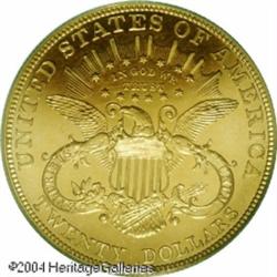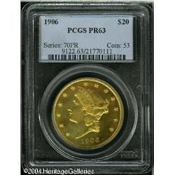 1906 $20 PR63 PCGS. Only 94 proofs were produced o <B>1906 $20 PR63 PCGS.</B></I> Only 94 proofs were produced of the 1906 double eagle, and as with most other proof twenties attrition has taken a high toll over the years. That being said, there appear to be a higher number of survivors of this date than others with estimates ranging from a low of 40-50 pieces (Akers) to as many as 50-60 (Breen). This is a lightly hairlined example that shows some hazy reddish patina on the obverse. Curiously, the striking details are not complete over the highpoints, which may have contributed to the PR63 grade rather than any noticeable surface defects. Population: 10 in 63, 23 finer (11/04). <BR><BR><B>Important notice:</B> Heritage usually auctions material at the rate of 200-250 lots per hour. On some occasions eBay Live bid software or the Internet may not be able to keep up with the pace of the auction. We recommend placing a realistic absentee bid now as insurance to avoid disappointment. Occasionally the auctioneer may eliminate or reject an eBay Live bid, and the auctioneer may also reopen a lot after the close of the eBay live bidding (usually because we missed an audience bid), and may reject your bid even if it shows you as the winning bidder. By bidding via eBay Live, you agree that Heritage may award the lot to another bidder at its sole discretion under the circumstances described above or any other reasonable circumstances. Since eBay bids are not shown to us until we open the lot on the floor, we treat those bids just like floor bids. In most cases the floor responds before the eBay bid is presented to us, due to Internet lag time, so for consistency we have made it a policy that floor bids are always considered first over tie eBay live bids. Also please note that all Heritage lots purchased through eBay Live carry a 20% Buyer's Premium. Please make sure you read the Terms and Conditions before you bid. This lot is being auctioned in conjunction with a live floor auction by Heritage Galleries & Auctioneers. All final auction and invoice information will be supplied by Heritage Galleries & Auctioneers, and all other information should be considered preliminary. Lot:7069