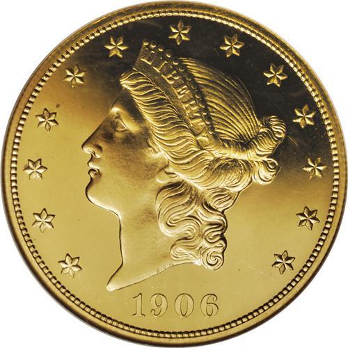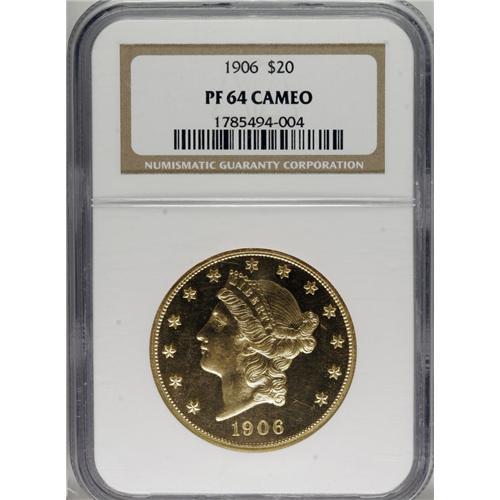 <B>1906 $20 PR64 Cameo NGC.</B></I> In the early 20th century, the Mint discouraged the production of contrasting cameo proof coins, especially after 1901, and examples are rarely encountered today. For example, less than half of the proof 1906 double eagles certified by NGC carry the Cameo designation, and not a single coin has been certified as an Ultra Cameo proof.<BR> Just 94 proof examples of this date were coined in the first place, and barely half of them survive today. Few Gem quality pieces exist, with PR64 examples such as this coin representing the usually seen grade. This piece is rather sharply struck, although some slight weakness is evident at the center of the reverse. Jeff Garrett and Ron Guth note that many proofs of this issue have a softly defined reverse, but they didn't provide any further explanation. Perhaps the reverse die was minutely dished.<BR> A delightful piece, this example has fully mirrored fields with only a few faint hairlines to limit the grade. The devices have just enough satiny luster to qualify for the Cameo designation. Both sides have brilliant light yellow color with a hint of orange toning that adds to the aesthetic appeal. Only nine finer examples of this date have been certified by NGC (4/07), including Cameo and non-Cameo pieces. A highly desirable piece, due in part to the rarity of associated business strikes. Population: 4 in 64 Cameo, 1 finer (3/07).<BR><BR><b>Shipping:</b> Coins & Currency (<a target="_blank" href="http://www.heritageauctions.com/common/shipping.php">view shipping information</a>)