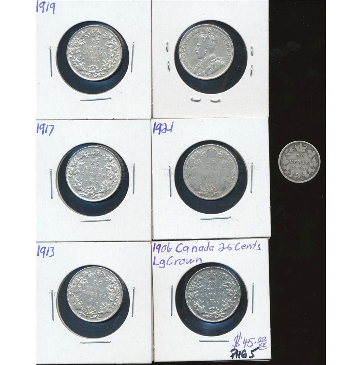 1906 25¢, 1913, 1917, 1919(2) & 1921. Lot of 6 coins along with 1892 10¢ Good to Fine.