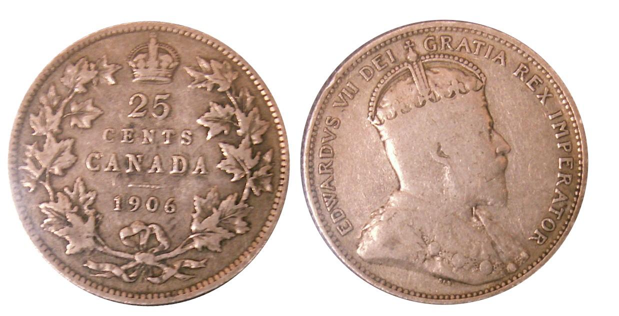 1906 25¢ Small Crown about Fine. The reverse grades F+ and the obverse VG-10. A superb circulated example with original silver grey tone. Problem free. Usually found in About Good or Good. Rarely seen in this condition. A nice opportunity to acquire this rare and sought after variety!.