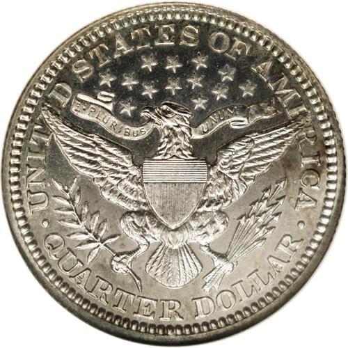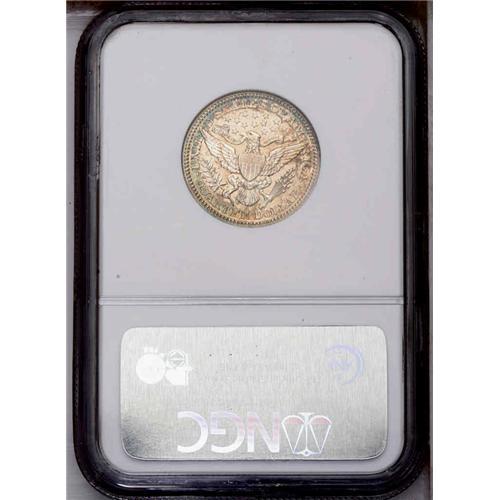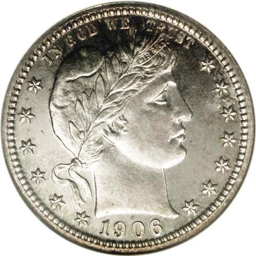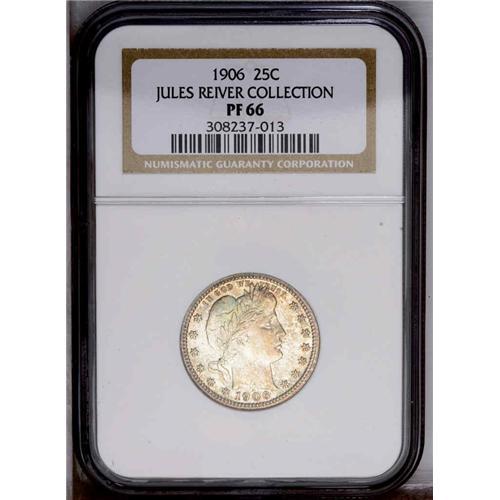 <B>1906<25C> PR66 NGC.</B></I> A technically outstanding proof Barber quarter that displays razor-sharp impressions on the design features. The bright surfaces are delicately toned in dappled russet and cobalt-blue colors, and are impeccably preserved. This Premium Gem will fit nicely into a high grade proof type set. Census: 43 in 66, 32 finer (10/05).
