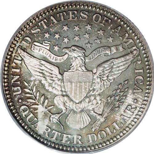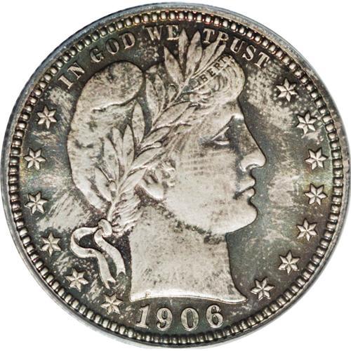 <B>1906 25C PR66 PCGS.</B></I> Boldly struck design elements, splashes of pleasing cobalt-blue and apricot patina overlay nicely reflective proof fields. The surfaces on both sides have obviously been well-cared for. An impressive grade for the issue. Population: 28 in 66, 19 finer (1/07).<BR><BR><b>Shipping:</b> Coins & Currency (<a target="_blank" href="http://www.heritageauctions.com/common/shipping.php">view shipping information</a>)